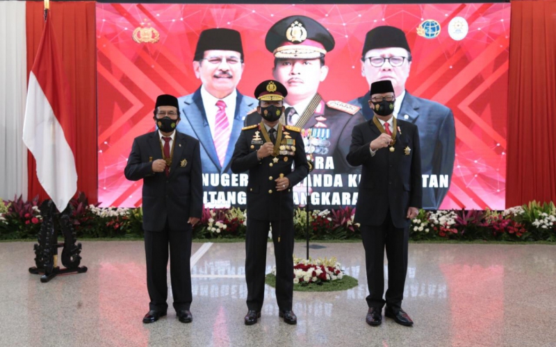 Kapolri Jenderal Idham Azis memberikan Tanda Kehormatan Bintang Bhayangkara Utama kepada Menteri Pendayagunaan Aparatur Negara dan Reformasi Birokasi Tjahjo Kumolo dan Menteri Agraria dan Tata Ruang/Kepala Badan Pertanahan Nasional Sofyan Djalil, Jumat (18/12/2020).