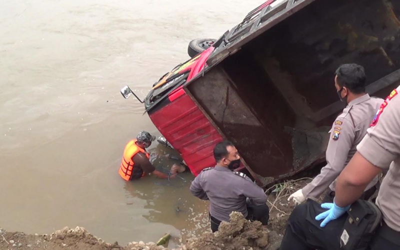 Diduga rem blong, sebuah truk muatan pasir tercebur ke Sungai Brantas Desa Sukoanyar, Kecamatan Mojo Kabupaten Kediri, Kamis (21/1/2021). Naas sopir truk terjebak di dalam truk tersebut dan tewa. Petugas mengalami kesulitan untuk melakukan evakuasi.