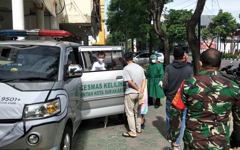 Maka Babinsa Kelurahan Kemlayan Koramil 03/Serengan Kodim/0735 Surakarta Serka A. Rumbawa bersama Bhabinkamtibmas Aiptu Sarjono ikuti penjemputan warganya dari puskesmas Jayengan yang akan melaksanakan Swab di RSBK Semanggi bertempat di RT 1 RW 1 Kelurahan Kemlayan Kecamatan Serengan, Rabu (20/01/2021).