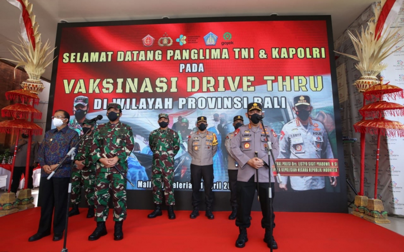 Panglima TNI Marsekal Hadi Tjahjanto dan Kapolri Jenderal Listyo Sigit Prabowo meninjau langsung pelaksanaan vaksinasi massal di Bali. Peninjauan itu dilakukan di GOR Kepaon Kodam Udayana dan Mall Bali Galeria, Rabu (21/4/2021).
