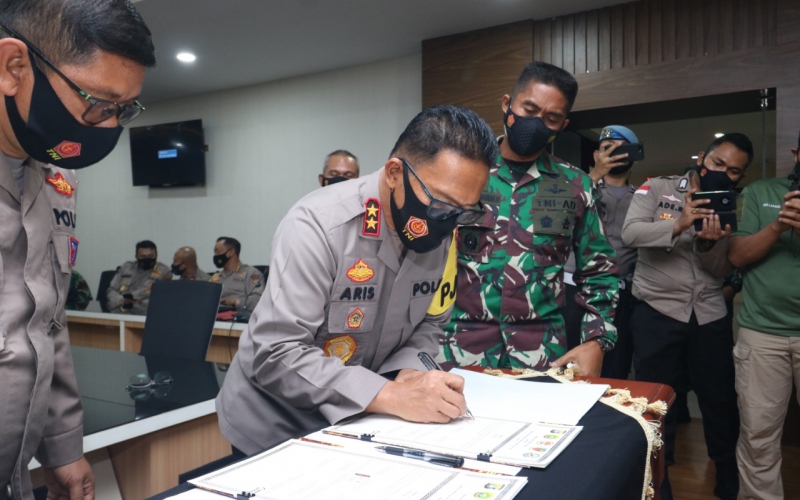 Selesai pelaksanaan Rapat Koordinasi dilanjutkan dengan Penandatanganan Perjanjian Kerja Sama antara TNI-Polri diwilayah Provinsi Kepri. (SURYA)