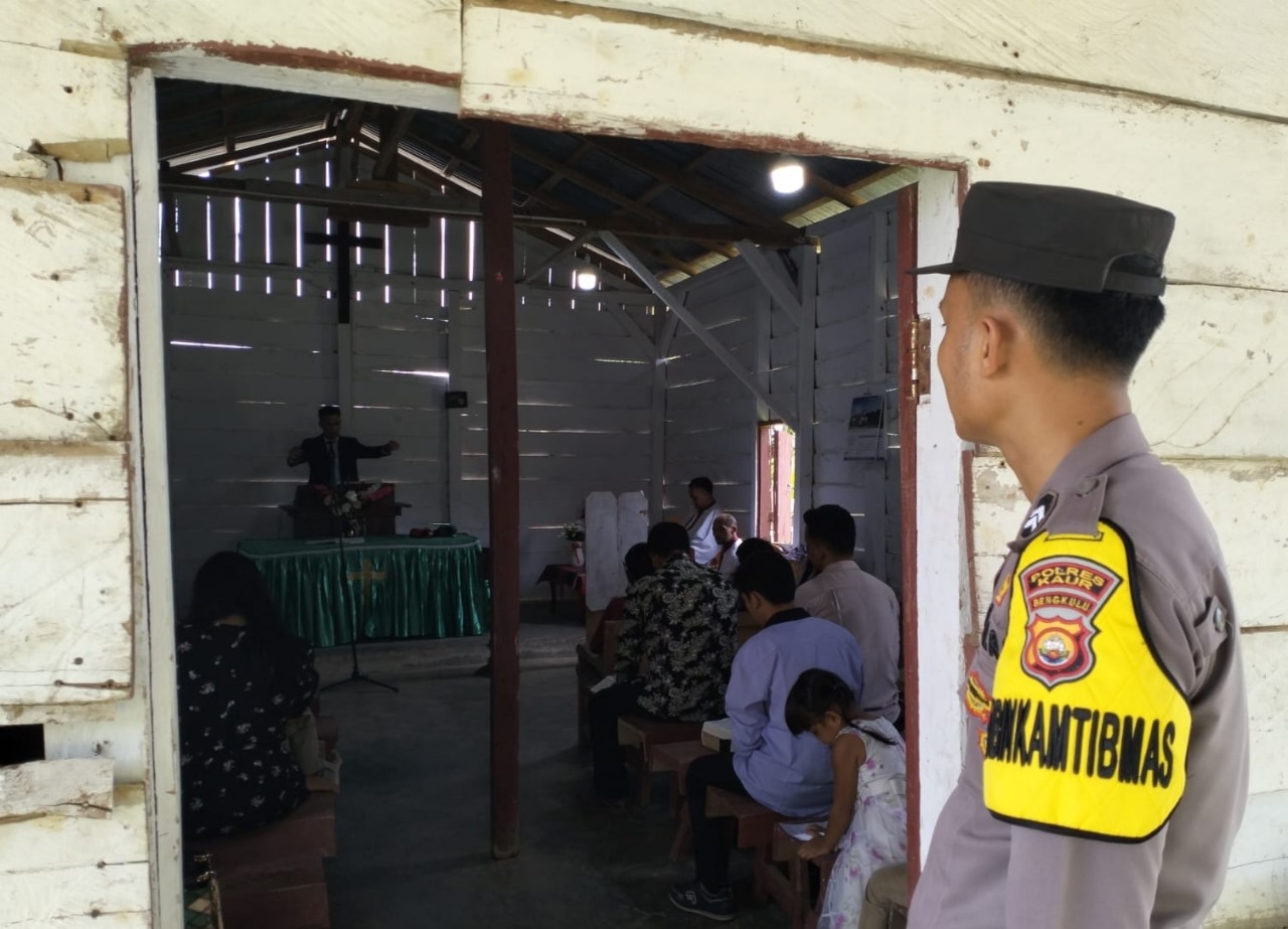 Kaur – Polsek Kaur Selatan Polres Kaur Polda Bengkulu, monitoring kegiatan pengamanan Ibadah Gereja Umat Kristiani di Postel HKBP Pondok Pusaka di Desa Padang Petron Kecamatan Kaur Selatan Kabupaten Kaur.