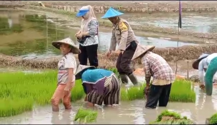Dalam sambang tersebut, Bhabinkamtibmas membantu warga melakukan pencabutan bibit padi dalam rangka MT 2.