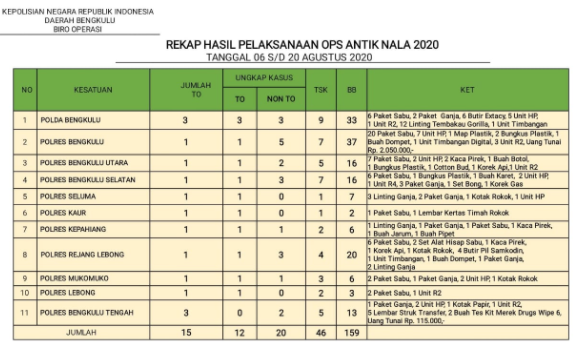 “Dari 46 tersangka ini, 12 merupakan Target Operasi (TO) Dan 20 merupakan non TO.” Kata Kabid Humas Polda Bengkulu Kombes Pol Sudarno S.Sos M.H, Jum’at (21/08/20).