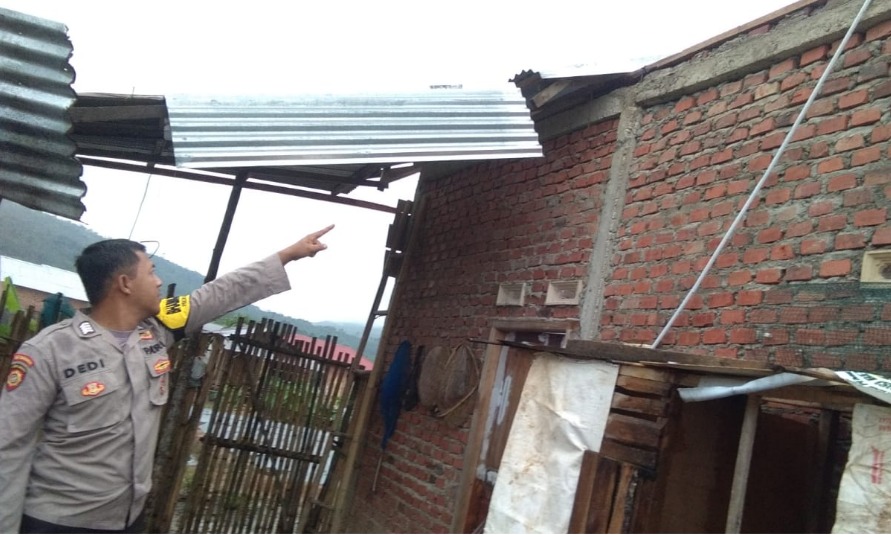 “Ini salah satu rumah kediaman warga mengalami kerusakan cukup parah dibagian atap akibat puting beliung,” lapornya.