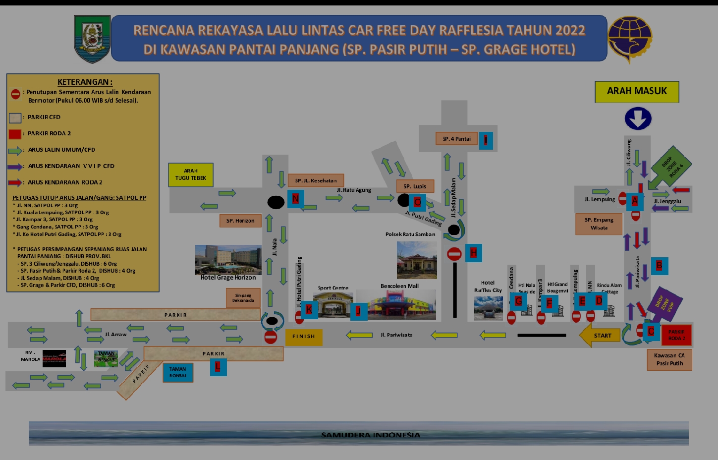 Bengkulusiberindo.co – Rekayasa arus lalin diterapkan pada acara car free day yang akan diselenggarakan besok pagi Minggu 23 November 2022. Bagi masyarakat yang telah memiliki rencana melintas daerah kawasan Pantai Panjang dapat memilih jalan alternatif lain.