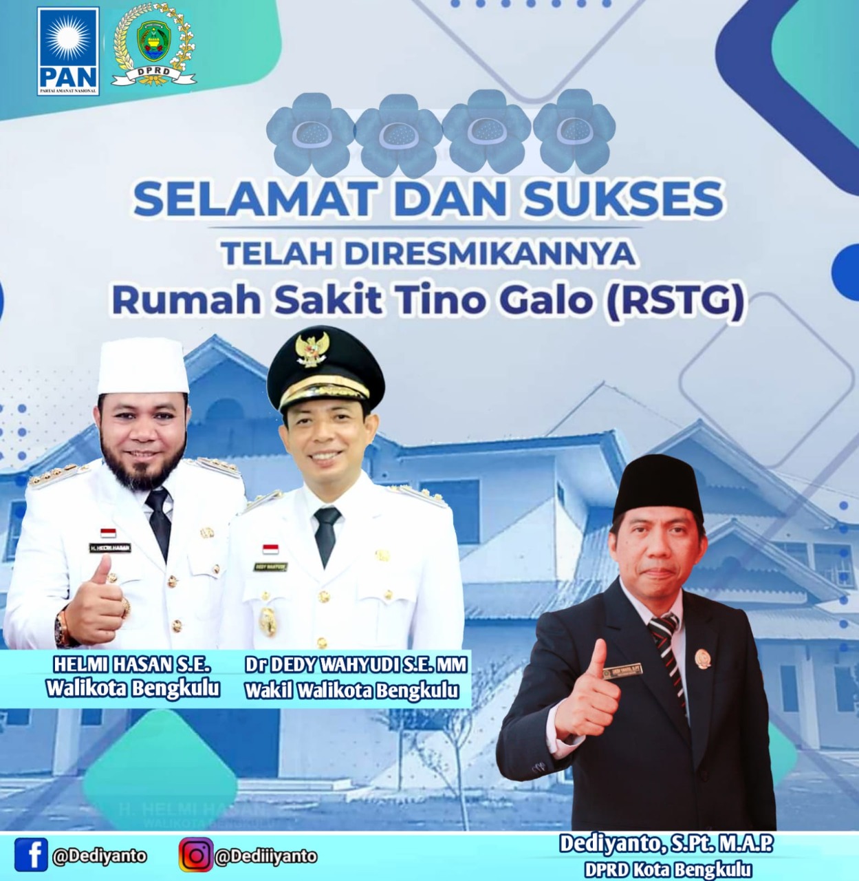 “Mohon Doa dari semua Pihak agar RS Tino Galo terus tumbuh kembang dan Prima lakukan pelayanan sehingga kalimat”Orang Miskin Dilarang Sakit” yang dulu sempat trend di Indonesia bisa hilang dengan hadirnya RSTG dan dengan konsep program Pro warga tidak mampu yg selama ini sudah berjalan di Rumah Sakit Kota,” ujar Dediyanto, SPt,MAP Sekretaris Fraksi PAN DPRD Kota Bengkulu.