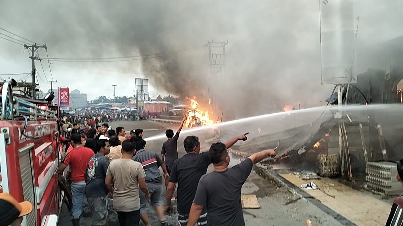“Sejumlah toko kelontong, manisan, pupuk dan lapak dagangan lainnya ikut terbakar. Sampai sekarang api masih belum padam,” ujar salah satu warga Giri Kencana, Warsito.