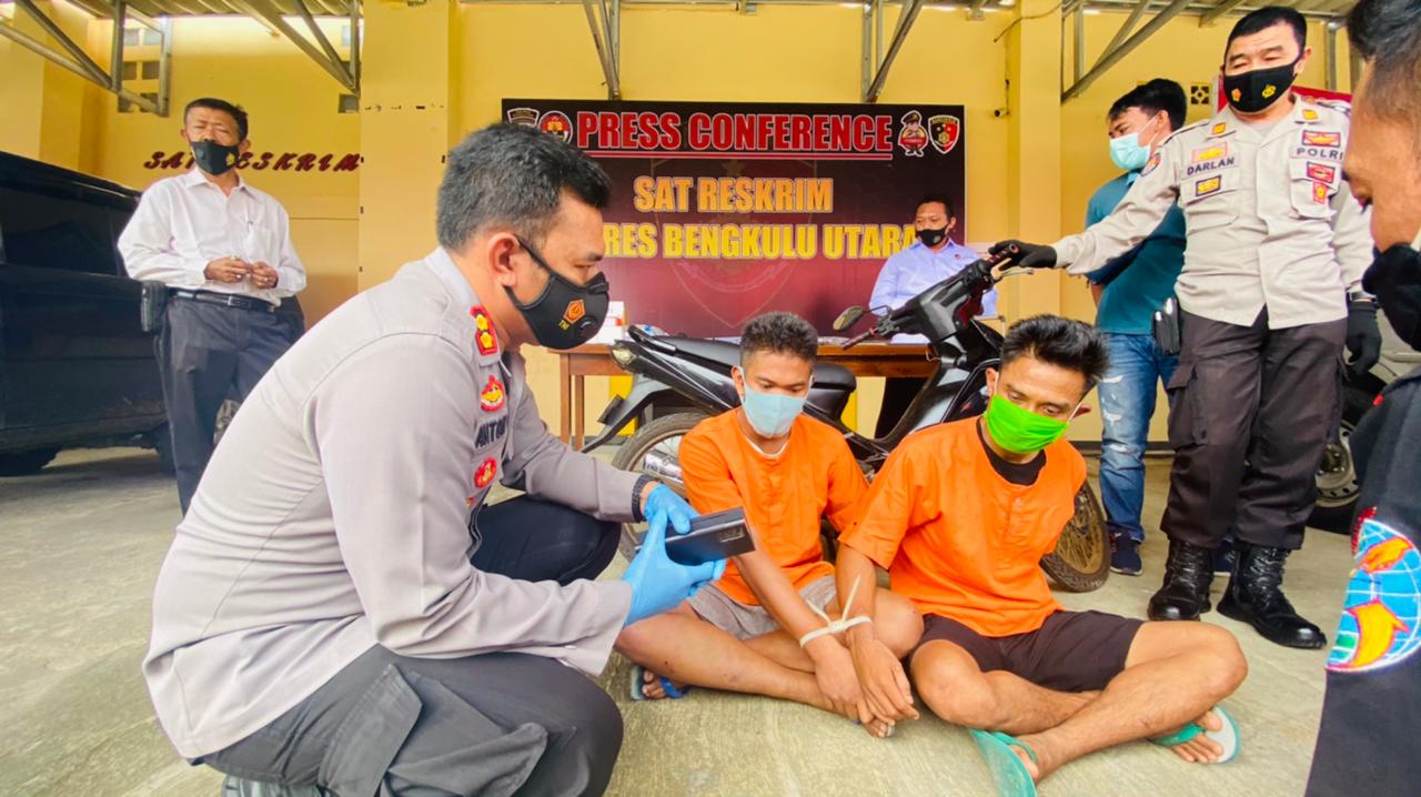 Polisi meringkus kedua terduga pelaku dikediamannya di Desa Gunung Selan, Kecamatan Kota Arga Makmur Kabupaten Bengkulu Utara. Selain diduga melakukan pencurian telepon genggam, kedua terduga pelaku juga harus bertanggungjawab atas dua aksi pencurian kendaraan bermotor.