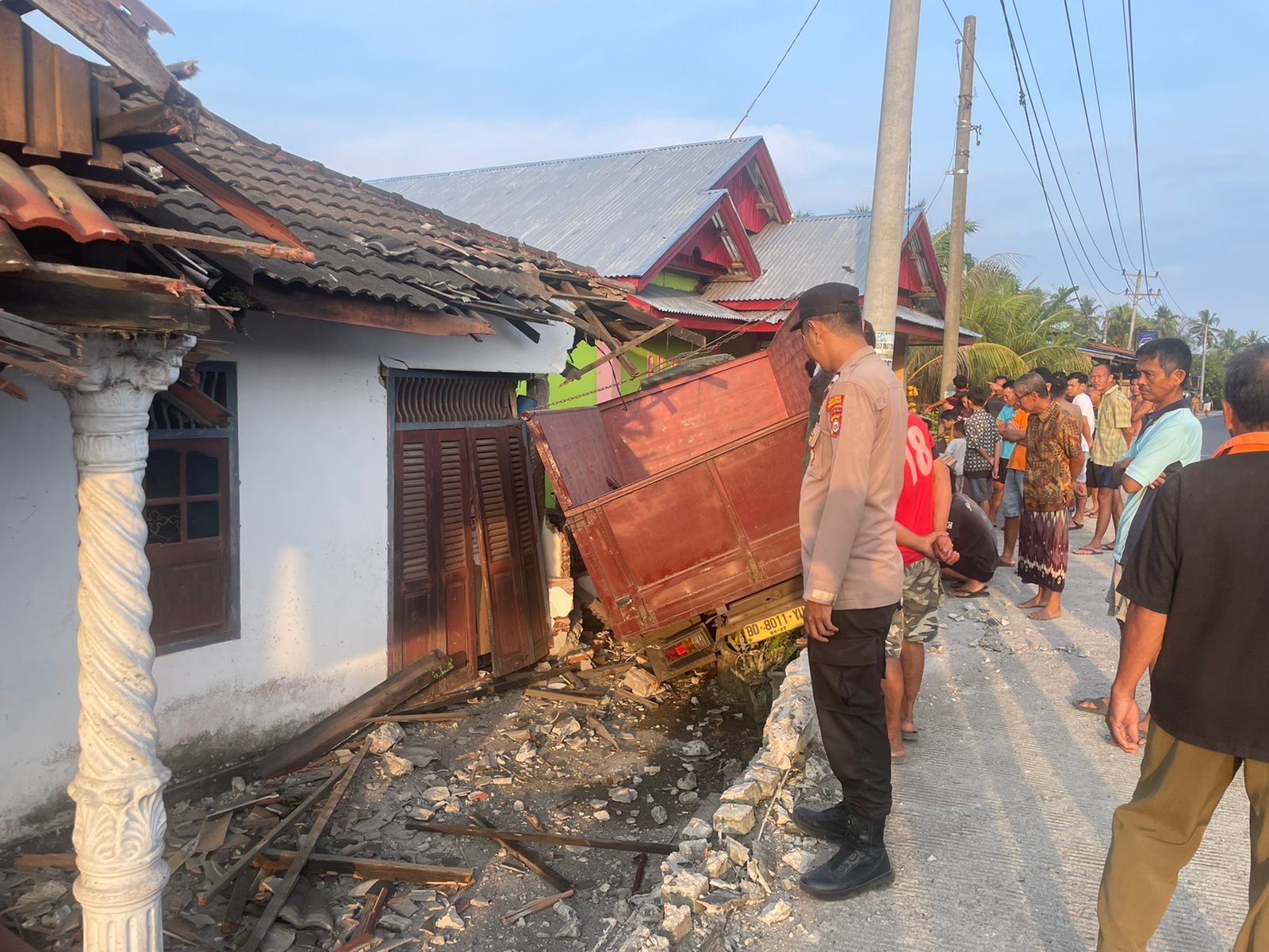 “Ada 2 unit rumah warga yang terkena hantaman mobil, yakni rumah warga milik Auri (61) yang mengalami kerusakan dibagian pagar, atap rumah, dinding kamar jebol, kabel lsitrik dari tiang listrik putus. Selanjutnya rumah warga Juharman (59) yang juga turut tertabrak mengalami kerusakan dibagian pagar, kaca kamar retak. Namun dalam kejadian ini tidak ada korban jiwa. Sementara sopir dan kernet langsung dievakuasi warga ke Puskesmas Kembang Mumpo untuk mendapatkan perawatan medis,” jelas Kapolres.