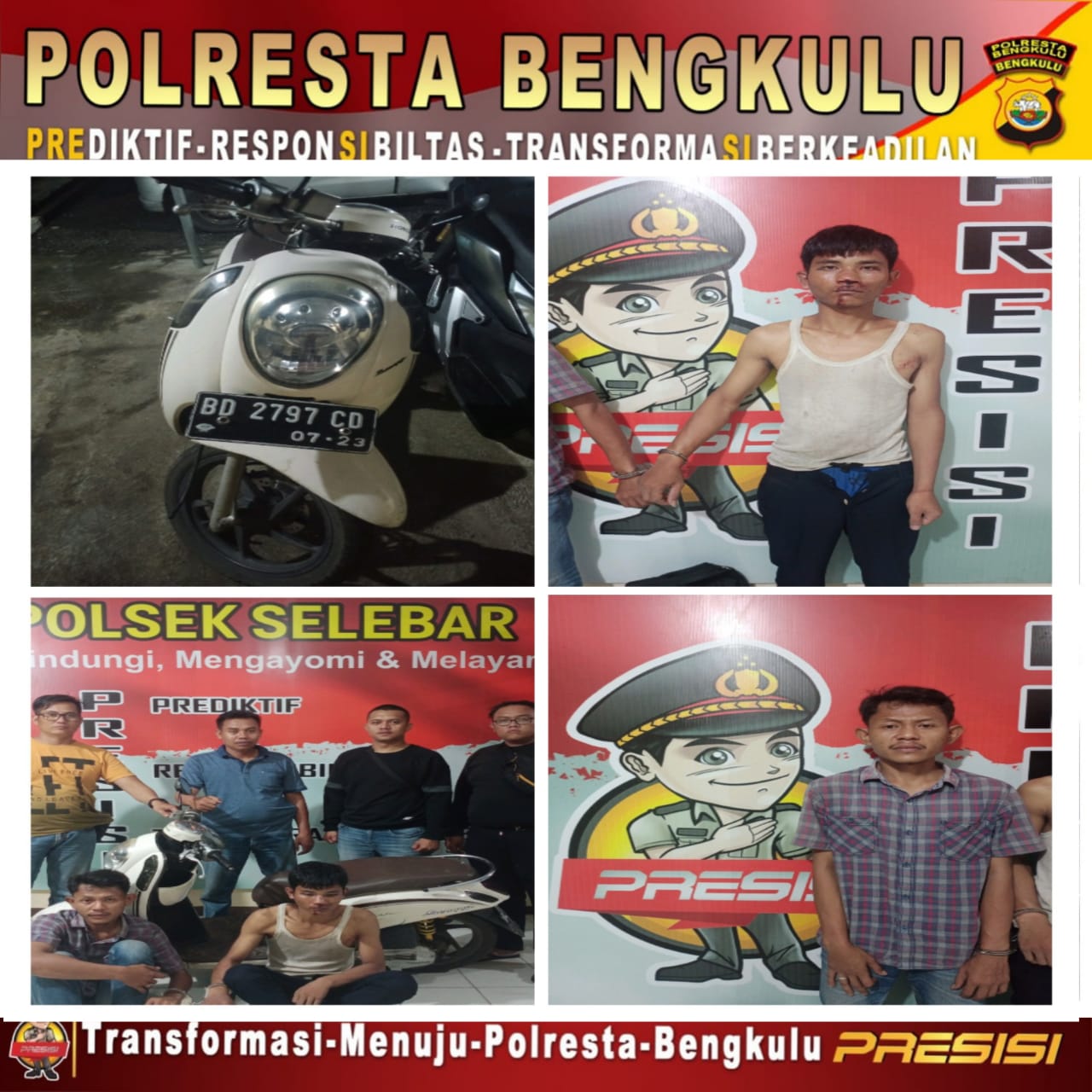 “Korban lantas menghubungi Polsek Selebar. Setelah itu, bersama warga, petugas melakukan pengejaran dan berhasil menangkap kedua pelaku,” terang Kapolresta Bengkulu Polda Bengkulu Kombes Pol Aris Sulistyono melalui Kasi Humas Iptu Nurlaila dalam keterangannya, Kamis (23/3/2023).