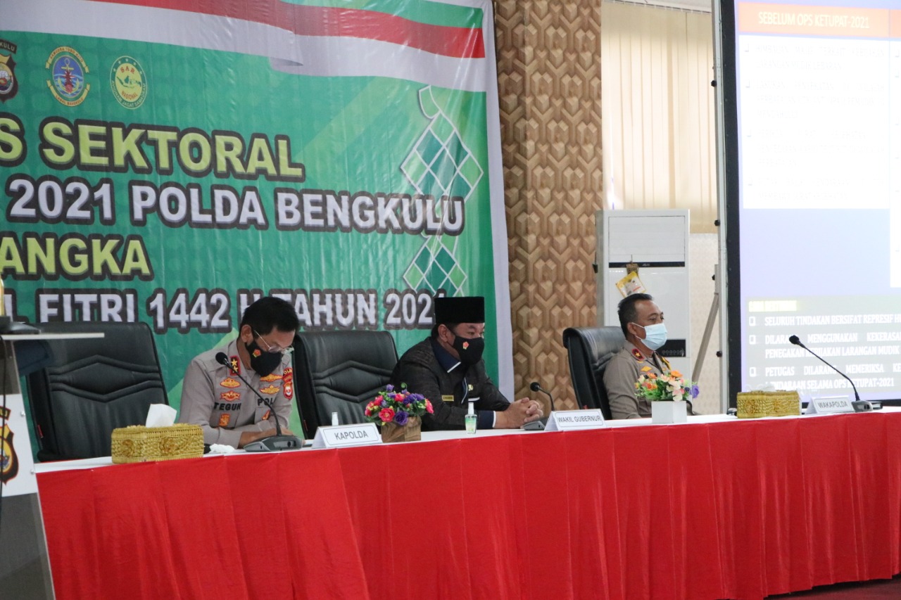 Rakor yang dipimpin oleh Kapolda Bengkulu Irjen Pol Drs Teguh Sarwono M.Si., membahas tentang persiapan pengamanan Idulfitri di masa pandemi Covid-19 dan implementasi larangan mudik tahun 2021.