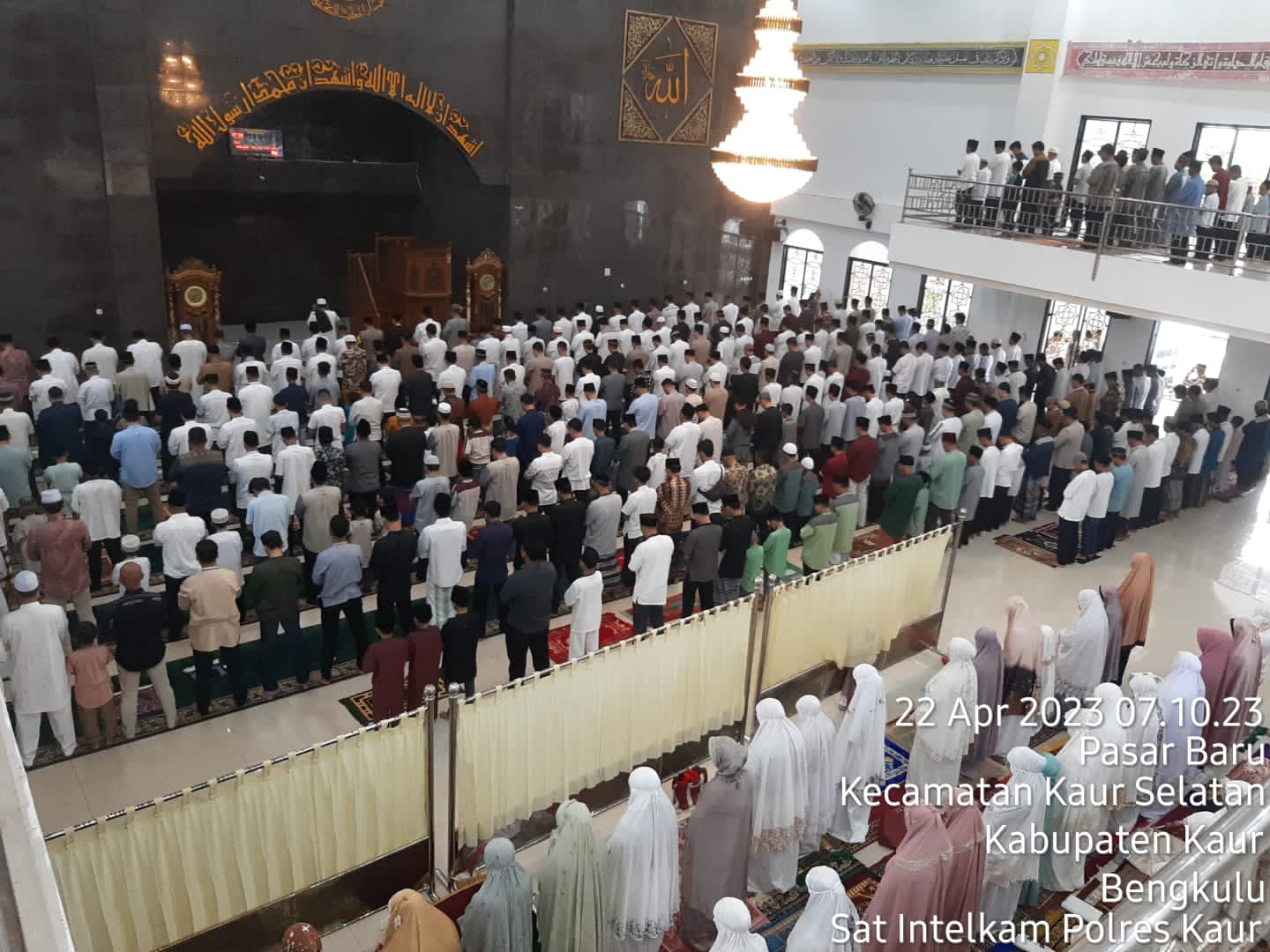 Kaur – Bersama unsur Forkopimda, Kapolres Kaur Polda Bengkulu AKBP Eko Budiman, melaksanakan Salat Idulfitri di Masjid Agung Al Kahfi Bintuhan, Sabtu (22/4/2023) pagi.