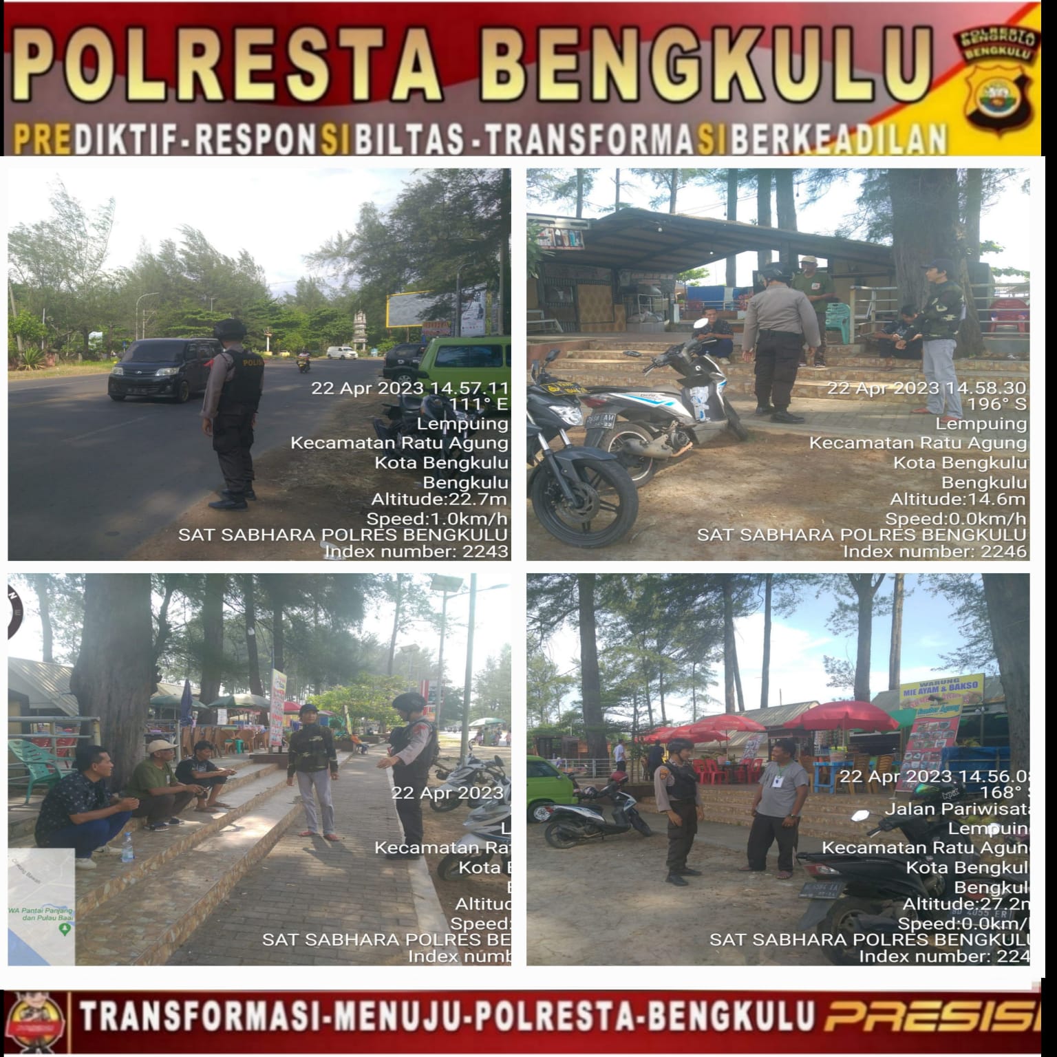 Bengkulu – Sabtu (22/4/2023) sore, tim Polresta Bengkulu Polda Bengkulu melaksanakan kegiatan pengamanan di objek wisata Pantai Pasir Putih.