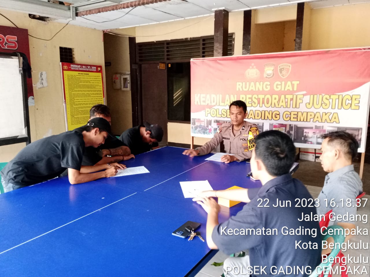 Kota Bengkulu – Kapolsek Gading Cempaka Polresta Bengkulu Polda Bengkulu melalui Bhabinkamtibmas Kelurahan jalan Gedang, mengahadiri perdamaian atau Problem Solving terkait pencurian di Aula terbuka Polsek Gading Cempaka.