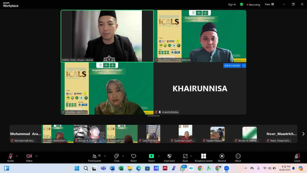 Kegiatan berlangsung 18 Agustus 2024, pukul 11.00 UTC+1 s.d selesai waktu Belanda. Hadir memberikan sambutan Ketua PCI NU Belanda Nur Ahmad dan Wakil Rektor I UNUSIA Fatkhu Yasik, M.Pd. Wakil Rektor I UNUSIA memberikan sambutan sekaligus membuka Kegiatan PkM Internasional tersebut.