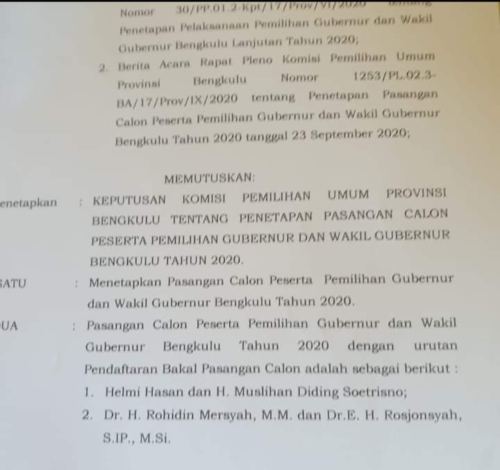 Sementara itu LO paslon Helmi-Muslihdan dan Rohidin-Rosjonsyah membenarkan jika calon mereka lolos sebagai calon Gubernur dan Wakil Gubernur Bengkulu.
