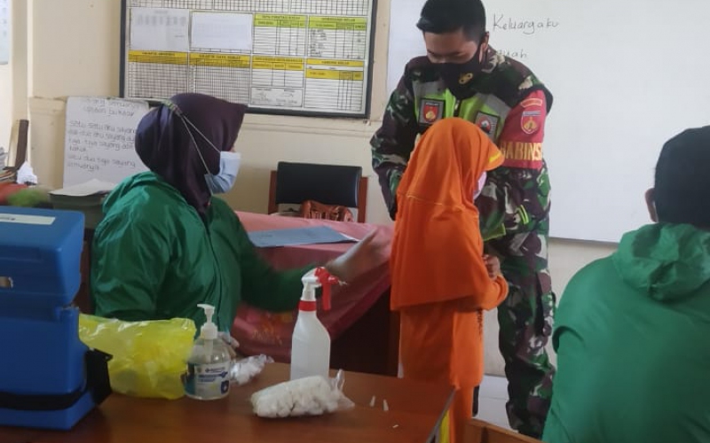Bintara Pembina Desa (Babinsa) Koramil 08/Bobotsari, Kodim 0702/Purbalingga Serda Sutanto turut mengikuti pendampingan program Bulan Imunisasi Anak Sekolah (BIAS). Upaya dalam rangka mendukung program kesehatan anak itu salah satunya dilakukan di MI Maarif NU Limbasari, (22/11/2020).