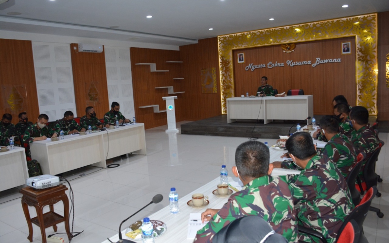 Jelang libur panjang Natal dan Tahun baru 2021 di tengah masa pandemi Covid-19, Danrem 072/Pamungkas Brigjen TNI Ibnu Bintang Setiawan S.I.P. M.M memberikan pengarahan kepada para Dandim, Danyonif 403/WP, Dansatdisjan dan Kabalak Korem 072/Pmk bertempat di Ruang Manunggal Makorem 072/Pmk. (Rabu, 23/12/2020)