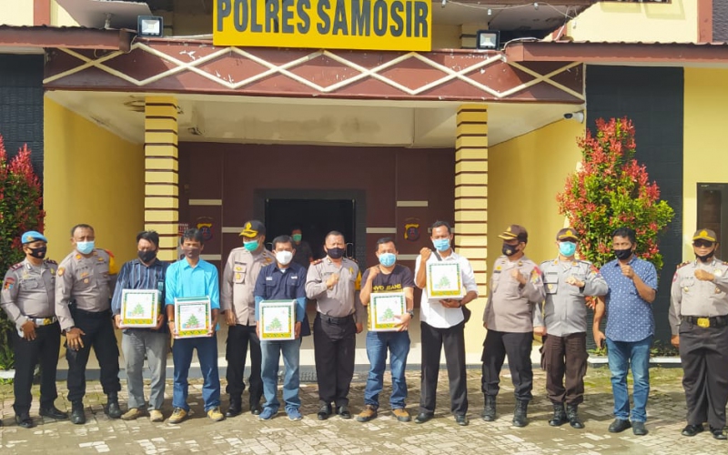 Kepala Kepolisian Resor Samosir AKBP M. Saleh memberikan bingkisan atau paket Natal kepada insan pers yang beragama Nasrani di halaman Mako Polres Samosir, Rabu (23/12/2020). Selain insan pers, bingkisan juga diberikan kepada Personel Polri, ASN, PHL Polres Samosir.
