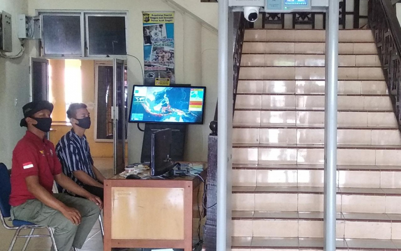 Sebagai upaya untuk mencegah penyebaran virus corona (Covid-19), di pintu masuk Kantor Bupati Aceh Singkil dipasang alat deteksi pengukur suhu badan bagi pengunjung dan pegawai setempat.