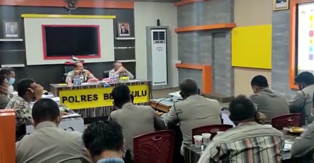 Bengkulu, Siberindo.co – Dalam rangka mendukung pelaksanaan Program Prioritas Kapolri bidang Penataan Kelembagaan aksi menata Hubungan Tata Cara Kerja (HTCK) di seluruh fungsi Polri yang berorientasi kepada pelayanan masyarakat (pelayanan satu atap), Kapolres Bengkulu AKBP Pahala Simanjuntak S.IK hari ini pimpin rapat di ruang Command Center Parama Satwika Polres Bengkulu, Selasa (23/3/2021).