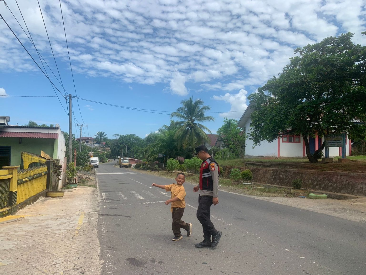 Bengkulu Utara – Personil Polsek Batik Nau Polres Bengkulu Utara Polda Bengkulu membantu para siswa SD untuk menyeberang jalan, Jumat (24/03/23).