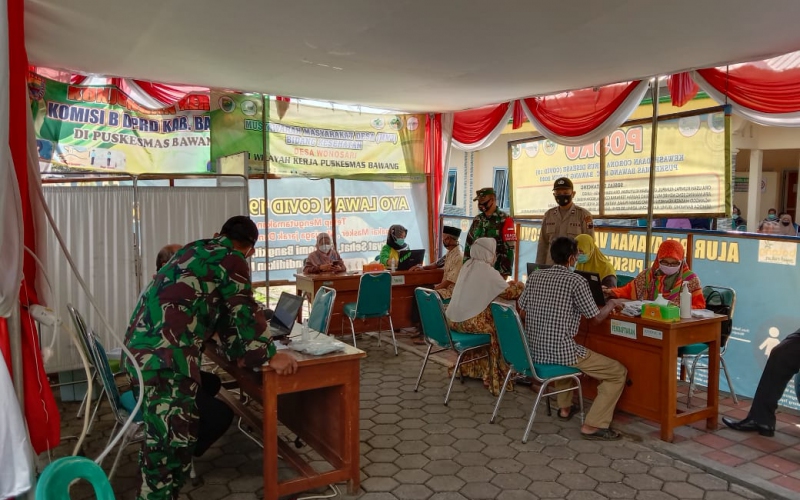 Babinsa Koramil 04/Bawang mendampingi serta memonitor kegiatan Vaksinasi Covid- 19 tahap I bagi para lansia di Puskesmas Bawang, Kecamatan Bawang, Kabupaten Batang, pada jumat (23/4/21)