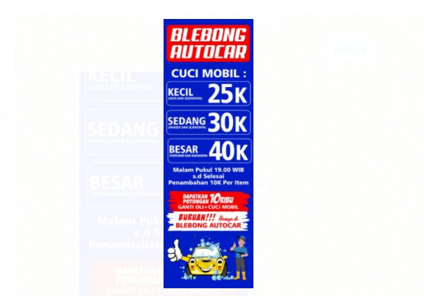 Berikut rincian daftar harga cuci mobil di Blebong Autocar: