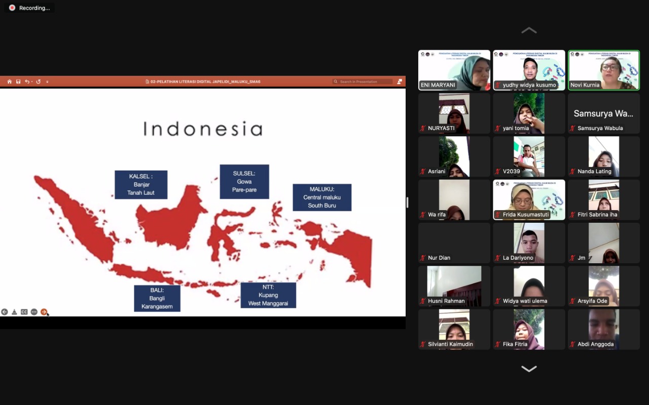 Bengkulu, Siberindo.co – Pelatihan Literasi Digital untuk Generasi Muda Maluku telah digelar oleh Jaringan Pegiat Literasi Digital (Japelidi) dengan dukungan My America Surabaya, Kedutaan Amerika Serikat, sabtu (23/4) secara daring.