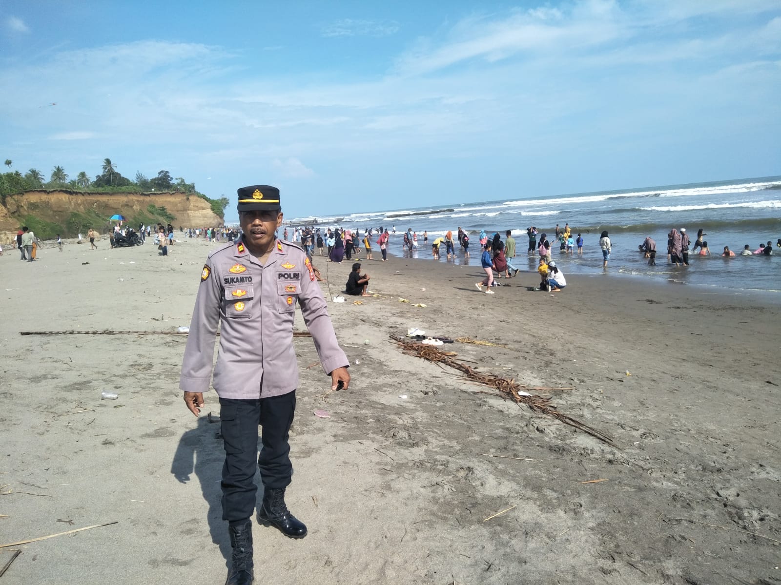 Tampak Kapolsek Lais yang juga sebagai Perwira Pengendali Pengamanan Iptu Sukamto memimpin langsung pelaksanaan patroli d objek wisata dan juga memberikan himbauan kepada pengunjung objek wisata untuk tidak berenang di laut setelah sebelumnya juga telah dipasang spanduk larangan untuk berenang di laut.