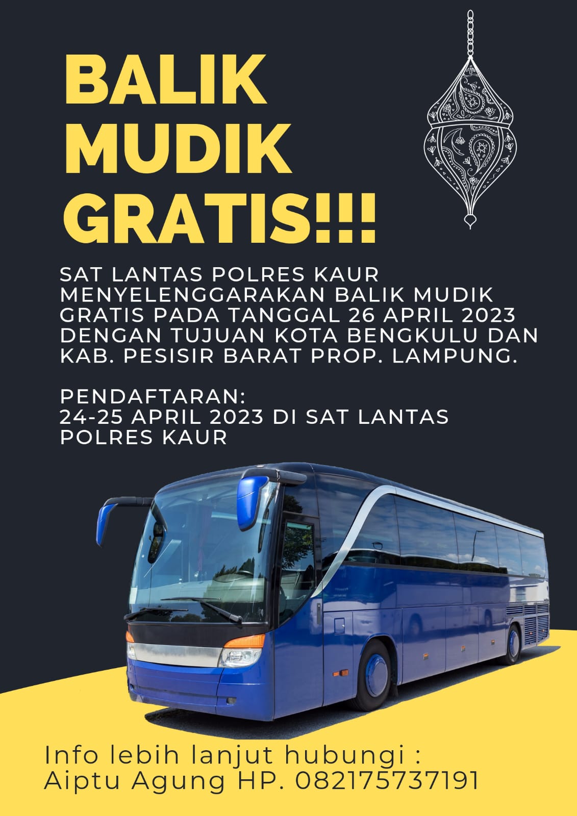 Kaur – Satlantas Polres Kaur Polda Bengkulu mengadakan program Balik Mudik Gratis pada 26 April 2023 nanti, dengan tujuan Kaur ke Kota Bengkulu dan Kaur ke Kabupaten Pesisir Barat Provinsi Lampung.