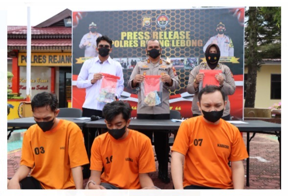 Kapolres Rejang Lebong Polda Bengkulu AKBP Tonny Kurniawan didampingi Kasat Narkoba Iptu Cahya Prasada Tuhuteru dan Kasi humas Iptu Bertha Anggraeni Ginting saat press release di Mapolres Rejang Lebong, Selasa (24/5/2022) menjelaskan, ketiganya dijerat dengan pasal 112 ayat 1 UU Nomor 35 Tahun 2009 tentang Narkotika dengan ancaman pidana penjara paling singkat 4 tahun dan paling lama 12 tahun dan denda paling sedikit Rp 800 juta dan paling banyak Rp 8 miliar.