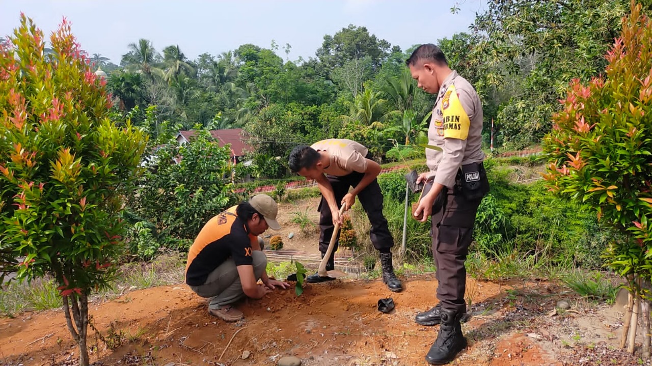 Aksi penghijauan Polsek Batik Nau digelar dengan menanam 30 bibit pohon di sekeliling Mako Polsek Batik Nau, Rabu (23/08/23)