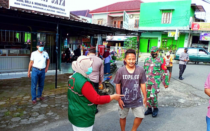 Anggota Koramil 13/Nogosari Kodim 0724/Boyolali yang dipimpin oleh Pelda Suyatno Bersama anggota Polsek Nogosari dan anggota Puskesmas serta anggota Satpol PP Nogosari menggelar Operasi Yustisi di Perempatan Pasar Nogosari, Kabuaten Boyolali. Sabtu (23/01).