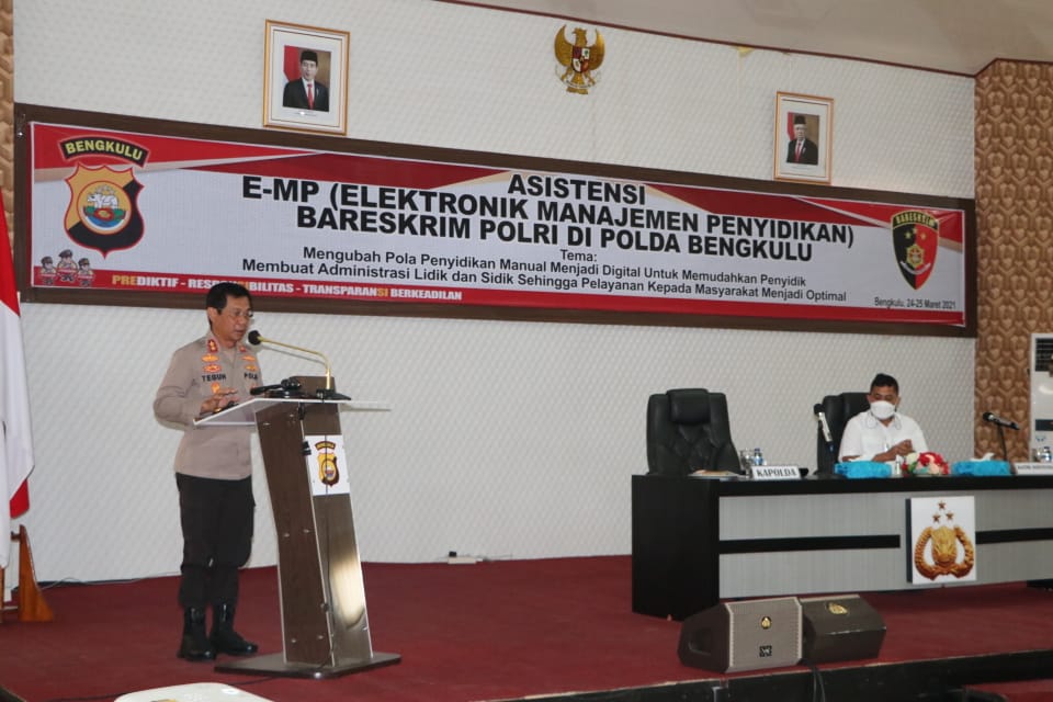Kapolda Bengkulu Irjen Pol Drs Teguh Sarwono, M.Si, saat membuka pelatihan dan asistensi mengatakan pelatihan E-MP ini penyidikan guna dapat meningkatkan kecepatan dan ketepatan dalam memberikan layanan dan informasi mengenai penyidikan.