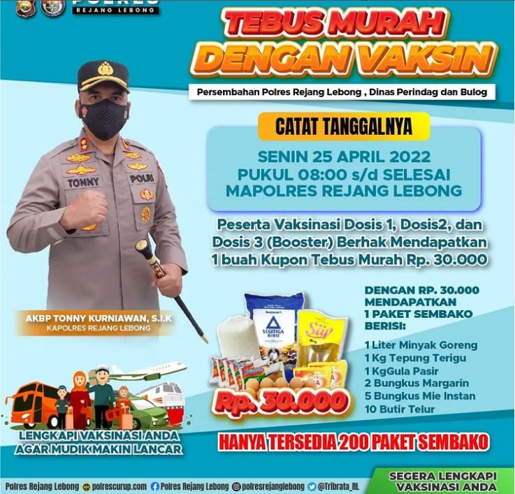“Setiap Peserta Vaksin Dosis 1,2 dan 3 Berhak Mendapatkan 1 Kupon Tebus Murah Senilai Rp. 30 Ribu Rupiah Untuk DiTukarkan Dengan 1 Paket Sembako,” terang Kapolres Rejang Lebong AKBP. Tonny Kurniawan, S.Ik.