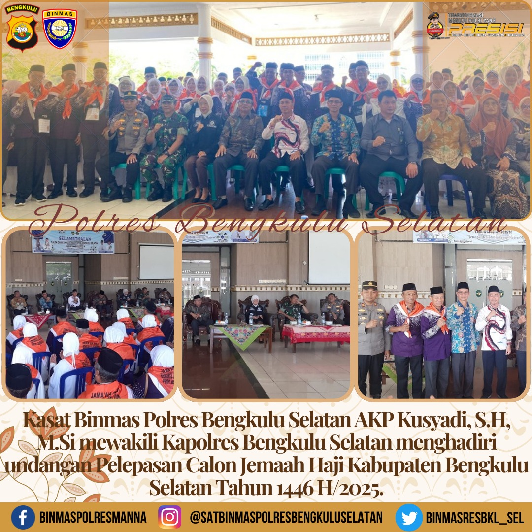 Polres Bengkulu Selatan, diwakili oleh Kasat Binmas AKP Kusyadi, S.H., (tautan tidak tersedia), menghadiri undangan Pelepasan Calon Jemaah Haji Kabupaten Bengkulu Selatan Tahun 1446 H/2025. Kegiatan ini berlangsung pada Kamis, 24 Mei tidak tepatnya 24 April 2025, di tempat yang tidak disebutkan.