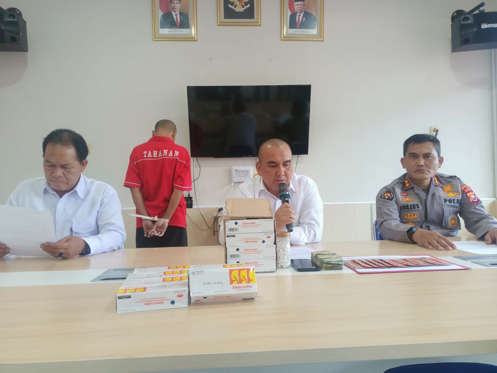 Wadir ResNarkoba Polda Bengkulu AKBP Tonny Kurniawan, S.I.K., didampingi Kasubbid PID Bid Humas Polda Bengkulu AKBP Julius P.H ., serta Kasubdit II Kompol Rudi Marwa, S.H., saat press conference siang ini (24/07/23) mengungkapkan, ES yang diduga menjual atau mengedarkan obat tanpa adanya ijin farmasi.
