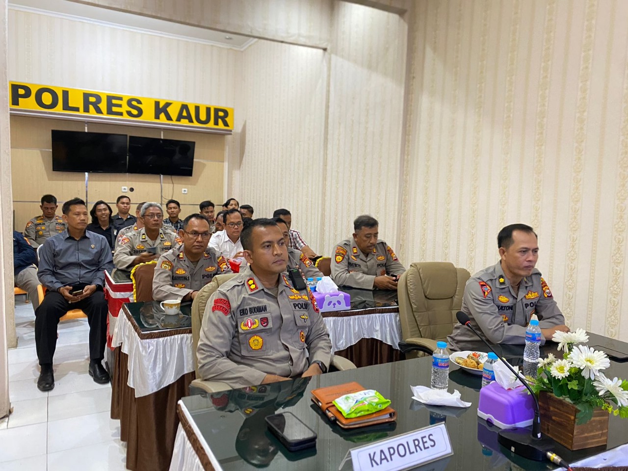Kapolres Kaur beserta para PJU mewakili kesatuannya mengikuti vicon tersebut secara virtual di Ruang Vicon Sie Tipol Polres Kaur, Kamis (24/08/2023) siang.
