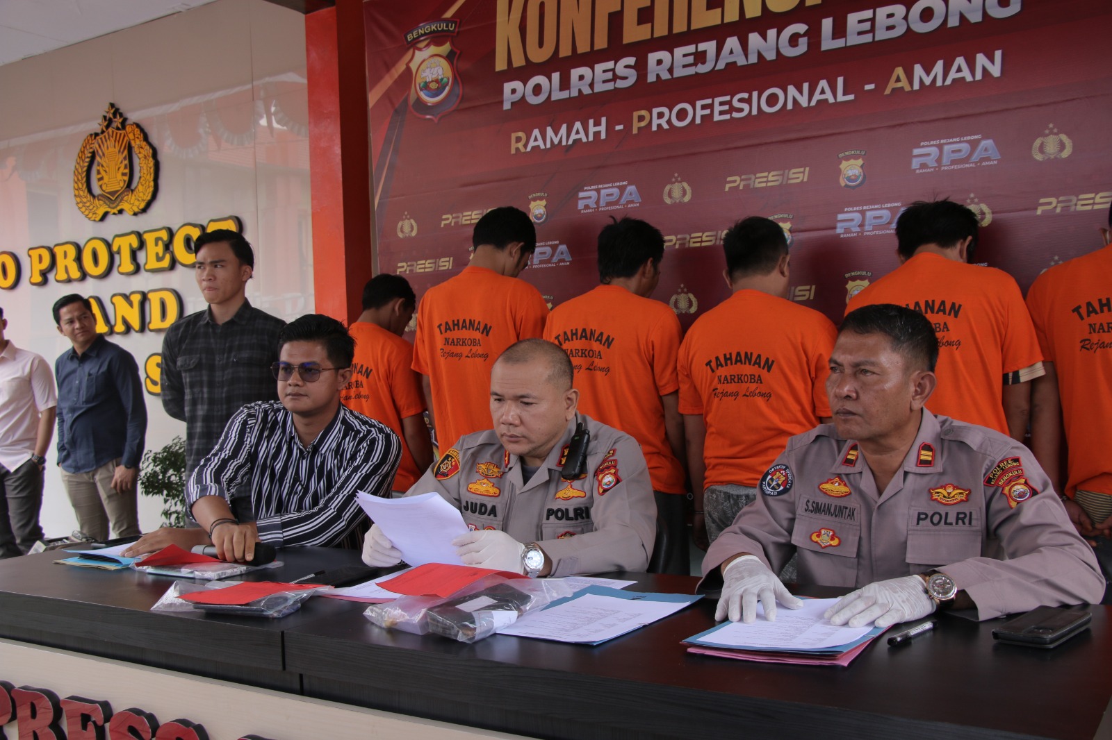 Kapolres Rejang Lebong Polda Bengkulu AKBP Juda Trisno Tampubolon, didampingi Kasatres Narkoba dan Kasi Humas saat press release di Mapolres, Rabu (24/8/2023) mengatakan, dari 4 pengungkapan kasus tersebut, pihaknya menangkap 6 orang pria yang telah ditetapkan sebagai tersangka.