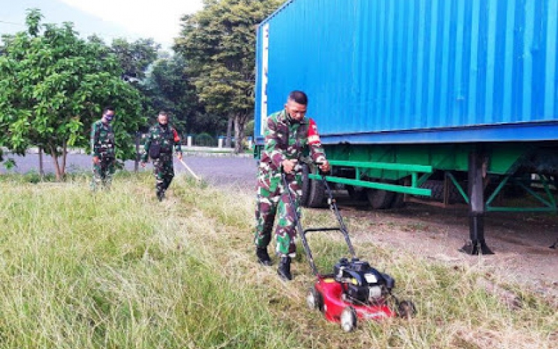 Puluhan Babinsa Koramil 1310-01/Bitung masuk ke lapangan membersihkan rumput-rumput liar yang sudah terlalu tinggi. Terlihat, Danramil juga turun tangan langsung memotong menggunakan mesin rumput, sebagian membersihkan bekas potongan rumput.