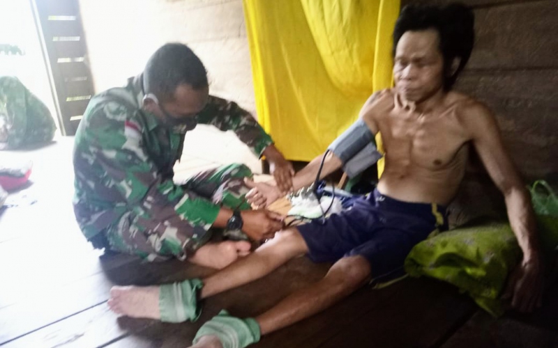 Prajurit Satgas Pamtas RI-MLY Yonif 407/PK anggota Pos Kout melakukan kegiatan bakti sosial pelayanan kesehatan dan pengobatan gratis kepada warga di Desa Bekuan, Kec. Ketungau Hulu, Kab. Sintang, Kalimantan Barat. Sabtu (24/04/21).