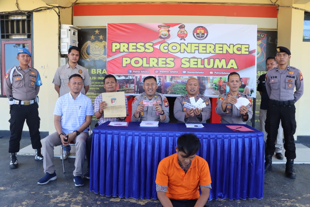 Kapolres Seluma AKBP Arif Eko Prasetyo melalui Wakapolres Kompol Tatar Insan, didampingi Kabag Ops AKP Yuda Setiawan, Kasat Reskrim Iptu Dwi Wardoyo, Kasi Humas Iptu Noprizal dan Kanit Reskrim Polsek Seluma Ipda Anwar Simanjuntak saat press release di Mapolres Seluma menerangkan, NAP ditangkap petugas menjual obat merek Samcodin.
