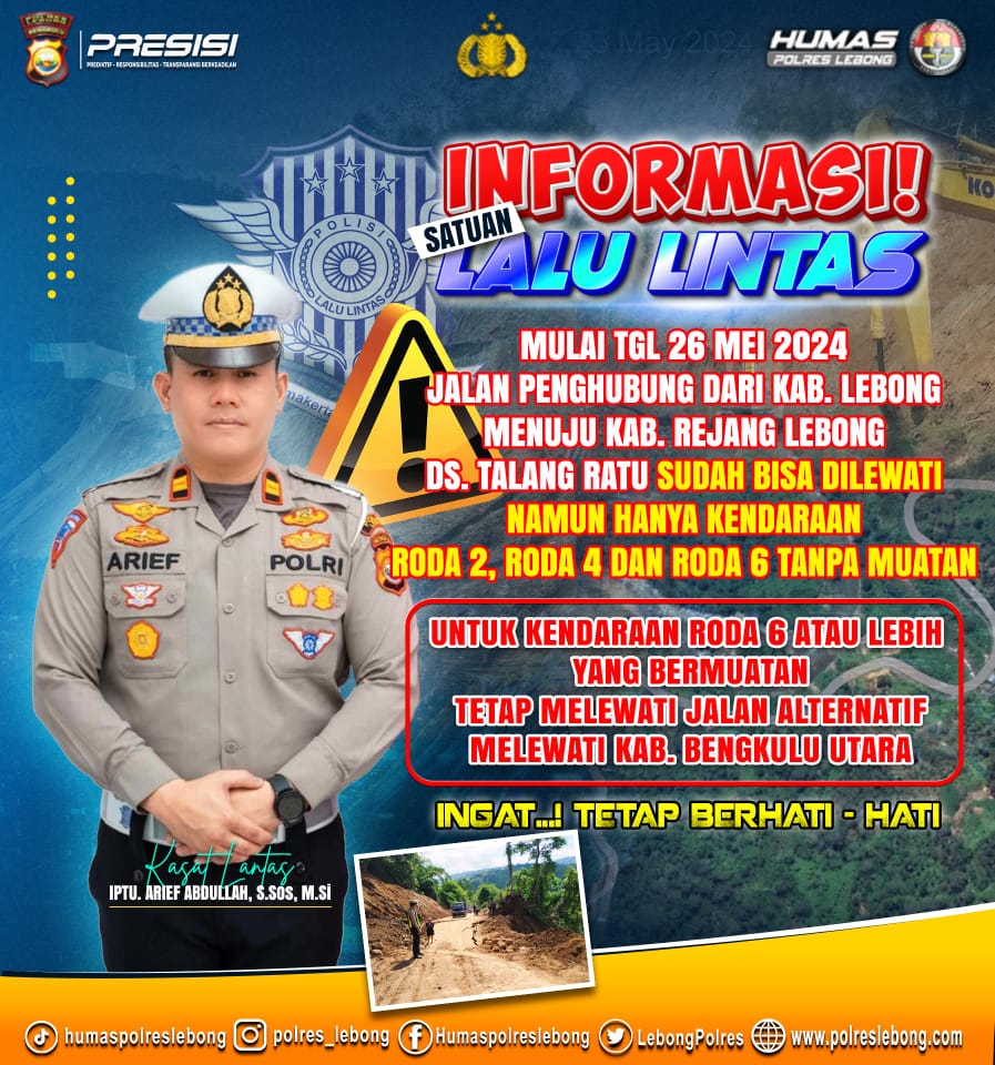 “Untuk kendaraan yang bermuatan, tetap melewati jalan alternatif terlebih dahulu, yaitu melewati Bengkulu Utara,” ujar Kasat Lantas.