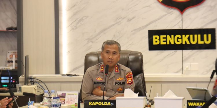 Rapat tersebut dipimpin langsung oleh Kepala Kepolisian Daerah Bengkulu, Irjen Pol. Mardiyono, S.I.K., M.Si., dan dihadiri oleh Pejabat Utama (PJU) Polda Bengkulu serta para Kapolres jajaran.