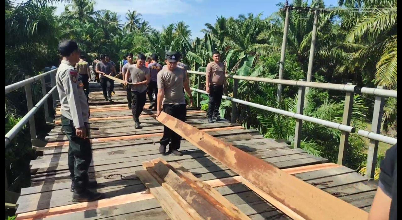 Mukomuko – Dalam rangka menyambut HUT Bhayangkara Ke 77, Kapolres Mukomuko AKBP Nuswanto, S.H., S.I.K., M.H., dan sejumlah personel dari Polres Mukomuko bersama dengan warga memperbaiki jembatan yang rusak.