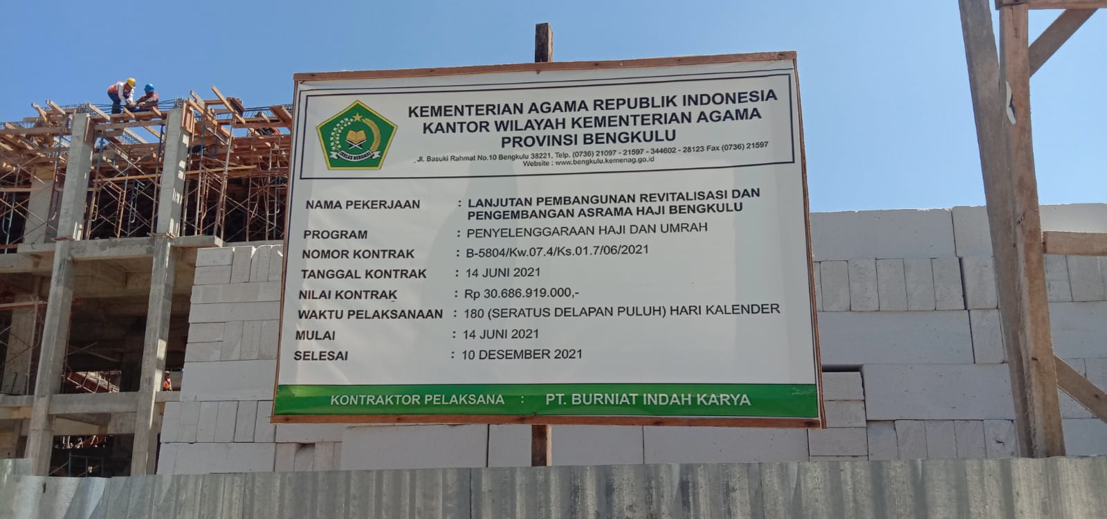 Bengkulu, Siberindo.co – Proyek lanjutan pembangunan revitalisasi dan pengembangan asrama haji Provinsi Bengkulu terus dikebut. Hingga tanggal 22 Agustus 2021, progres pembangunannya telah mencapai 31.095 persen.
