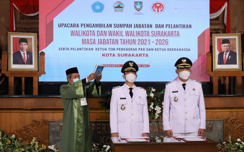 Gibran Rakabuming Raka dan Teguh Prakosa resmi dilantik menjadi Walikota dan Wakil Walikota Solo Periode 2021-2026 oleh Gubernur Jawa Tengah, Ganjar Pranowo di Gedung Graha Paripurna DPRD Surakarta pada, Jumat (26/2/2021).