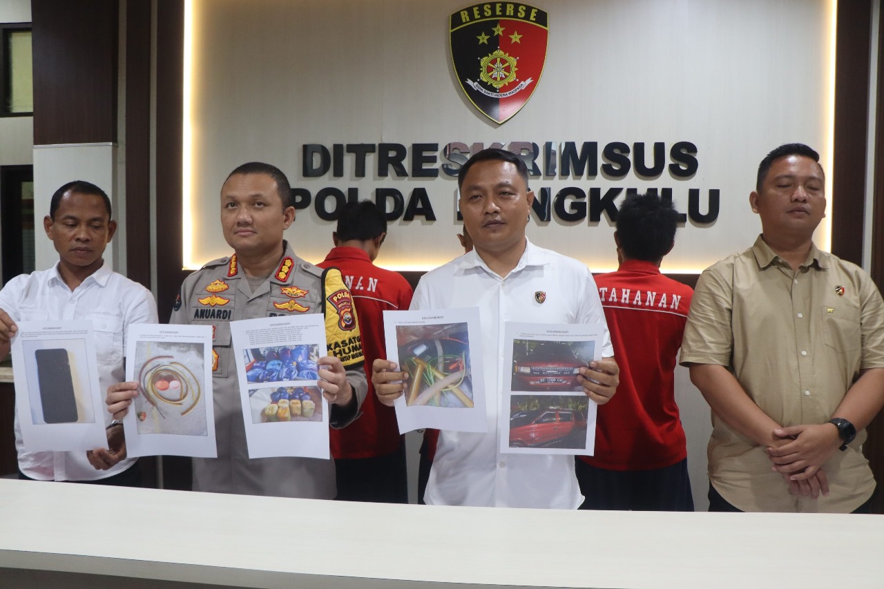 Dirreskrimsus Polda Bengkulu Kombes Pol I Wayan Riko Setiawan, S.Ik., M.H., Didampingi Kabid Humas Polda Bengkulu Kombes Pol Anuardi, S.Ik., M.Si., menyampaikan bahwa saudara YA menggunakan kendaraan mobil Isuzu Panther yang sudah dimodifikasi tangkinya, hari ini (27/03/24).